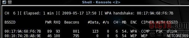 | 注意:由于是对指定无线频道的数据包捕获,所以有的时候大家会看到如下图17中一样的情景,在破解的时候出现了多达4个AP的数据报文,这是由于这些AP都工作在一个频道所致,很常见的。此时,选择我们的目标,即标为1的、SSID位dlink的那个数据包即可,输入1,回车后即可开始破解。 |