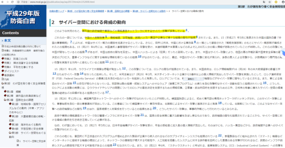 原文7 同国防白書では、「サイバー空間は、経済・社会発展の新たな支柱であり、国の安全保障の新分野である」、「サイバー空間における国際間の戦略競争は日増しに激化しており、多くの国がサイバー空間における軍事力を発展させている」、さらに、「中国はハッカー攻撃の最大の被害国の一つである」などの指摘がなされている。