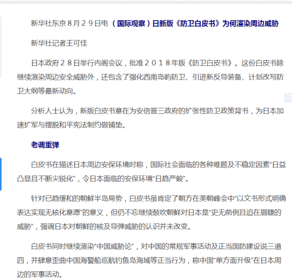 同时我国的新华社东京方面观察到了日本官方这一“可恶”的举动。光明正大的抹黑中国。渲染:“中国威胁论”。同时小编翻译到这里就已经很表示气愤了。