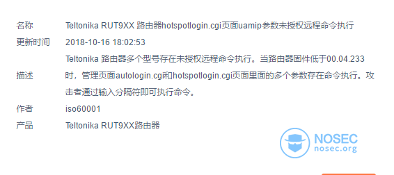 【漏洞预警】Teltonika路由器存在远程命令执行漏洞(CVE-2018-17532)