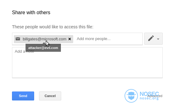 如果使用伪造的电子邮件地址代替你的姓名,则可以设计一个分享邀请欺诈,欺骗没有防范经验的用户允许你访问他的文件。攻击场景: