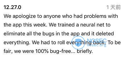 「我们要向那些在本周使用 app 时遇到问题的用户们道歉。我们训练了一个神经网络来消除 app 中的 bug,没想到它把所有的东西都消除了。我们现在只好进行数据恢复。目前暂时达成 100 % 没有 bug 的状态……」