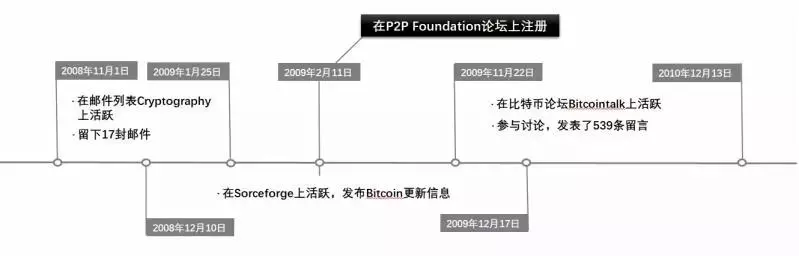 注:2008年到2009年间,中本聪在Cryptography邮件列表、Sorceforge开发平台、P2P Foundation网站、Bitcointalk论坛上先后现身