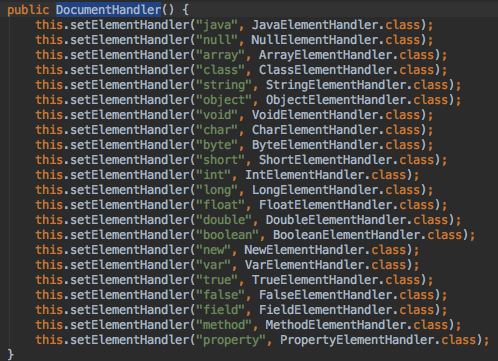 xmlDecoder对每种支持的标签都实现了一个继承与ElementHandler的类,具体可以在DocumentHandler的构造函数中看到: