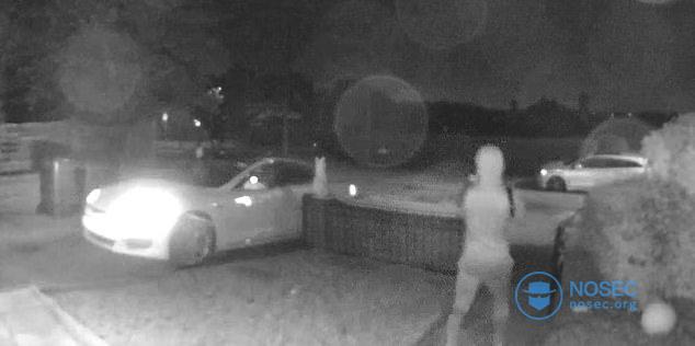 该盗贼胸前挂着一个背包,手持电线,走近停止院子里的特斯拉。奇怪的是,特斯拉的前灯竟然闪亮了,这是解锁的标志。