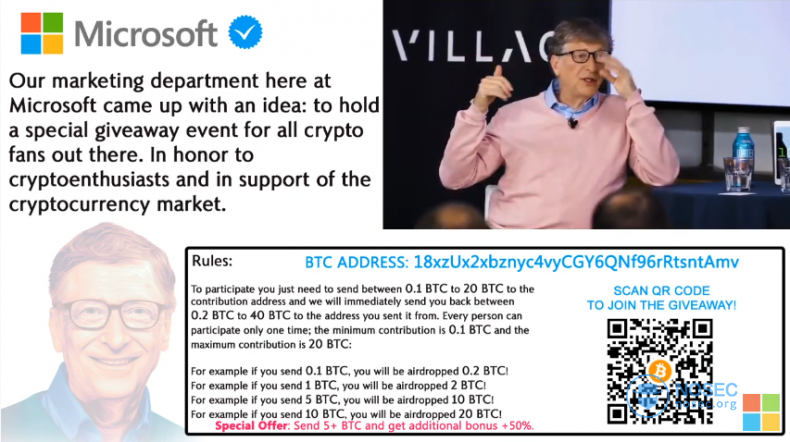 而微软并不是唯一一个受到大规模劫持事件影响的公司。总部位于德国的著名黑客组织,Chaos Computer Club的帐户也被劫持,传播过类似虚假信息。今年1月,YouTube创始人的YouTube帐户也遭到了同样的攻击。比尔·盖茨也不是唯一一个名字被如此滥用的大型公司CEO。以前许多骗局都借用加密货币社区的知名人物。