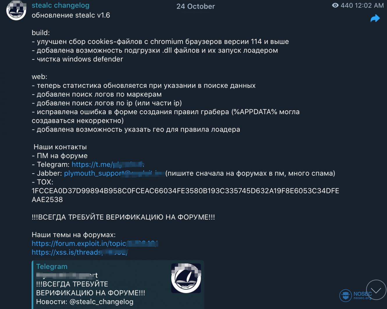 我们通过这些线索继续检索,发现了这个TG账号,由此账号推断,这个组织来自于俄语地区,且他们长期在xss.is和exploit.in上发广告卖数据。
