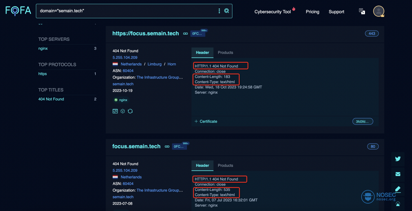 仔细对比发现,前两个域名的header都存在404 Not Found、Server: nginx、Content-Type: text/html的特征。